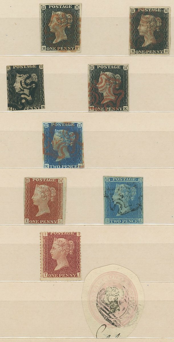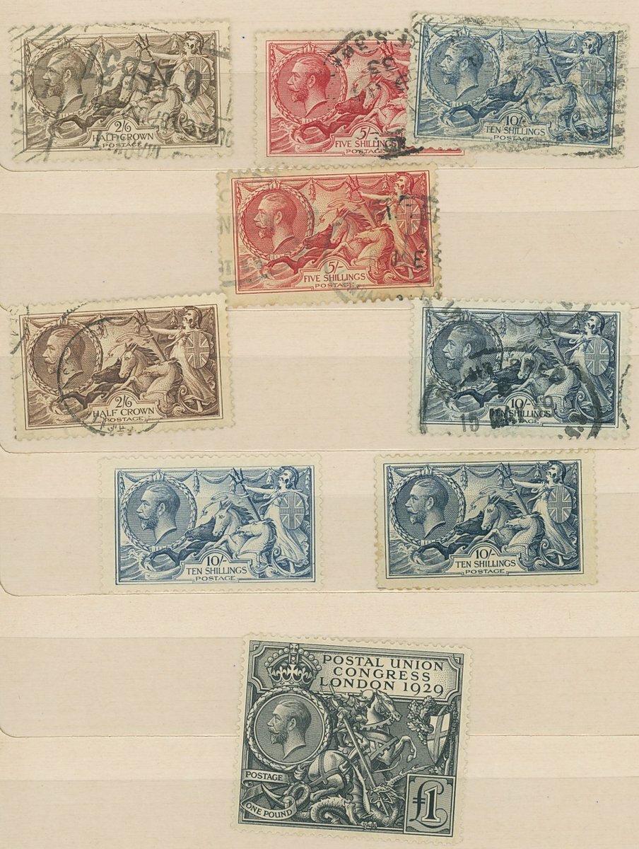 Selection in a small red stockbook, hundreds, including 1840 1d. (5 one on entire), 2d., 1864-79 1d. Plates to 225, a range of surface printed issues with 1883-84 5/- (3), 10/-, 1887-92 with values to 1/- (both), £1, Edward VII with values to £1 (both printings), 1918-19 Bradbury Wilkinson 10/-, 1929 P.U.C.£1, etc., mixed condition.