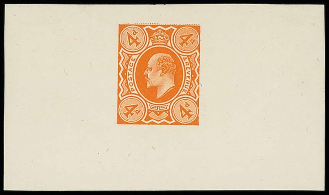 4d. die proof colour trial in orange on thick, ungummed, unwatermarked paper (c.70x41mm.). Fine and rare.