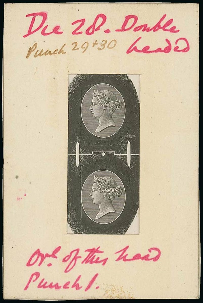 Double-headed die proof, with uncleared surrounds, inset on thick card (60 x 90mm), annotated in red manuscript. Photo.