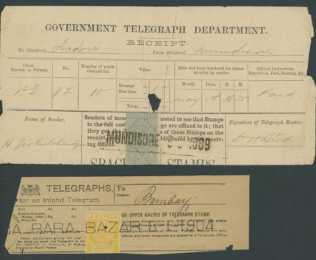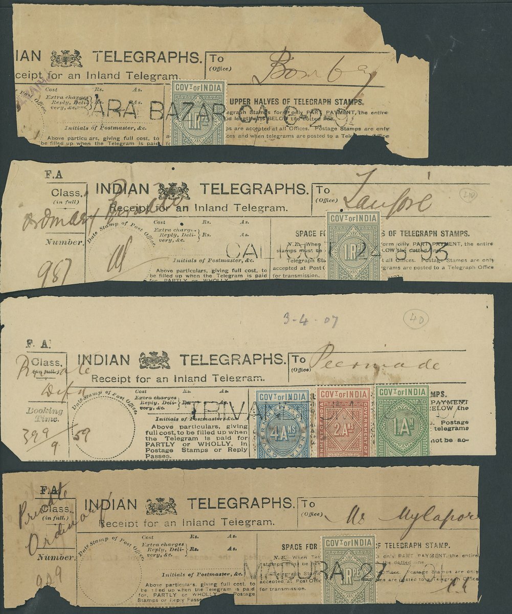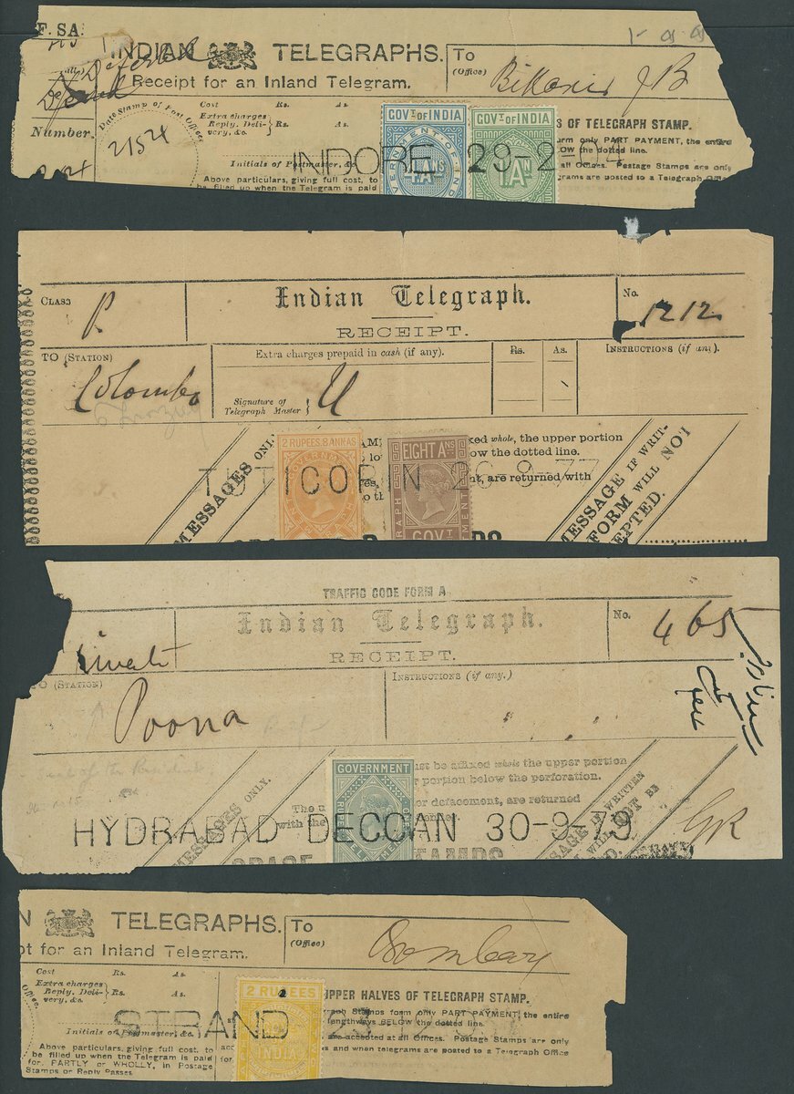 1870s-1900s telegraph receipts group (10), with a range of frankings, and cancellations including Bara Bazar (Calcutta), Calicut, Hyderabad, Indore, Madura, Mundisore, Trivandrum, Tuticorin; mixed condition.