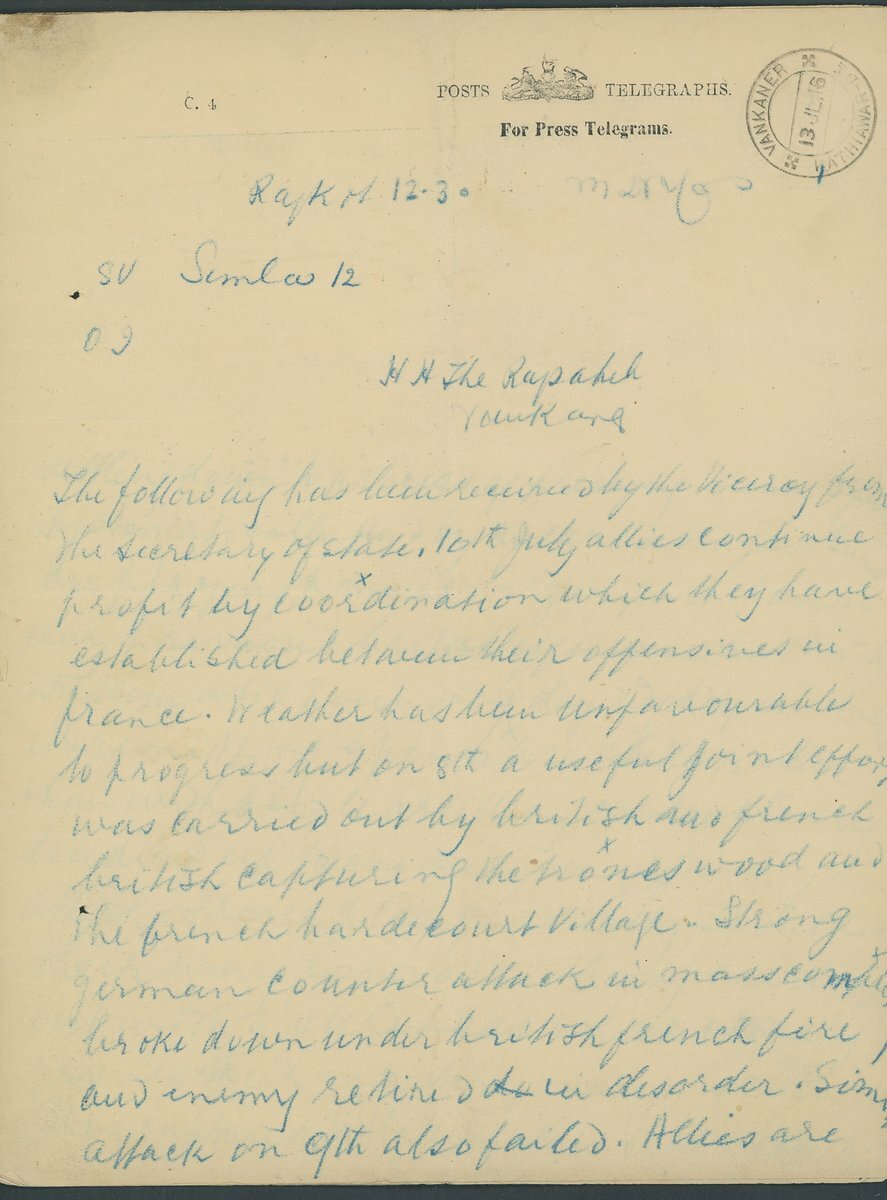 C.4 Press Telegraph forms (five sheets) used, Private Secretary to the Viceroy at Simla to Wankaner, 13th July 1916, with contents concerning military action in France.