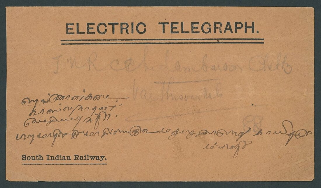 G.41 F South Indian Railway Company telegraph, sent Rangoon (Burma) to Vaitheeswarankoil (Tamil Nadu), 9th December 1913, with cover headed