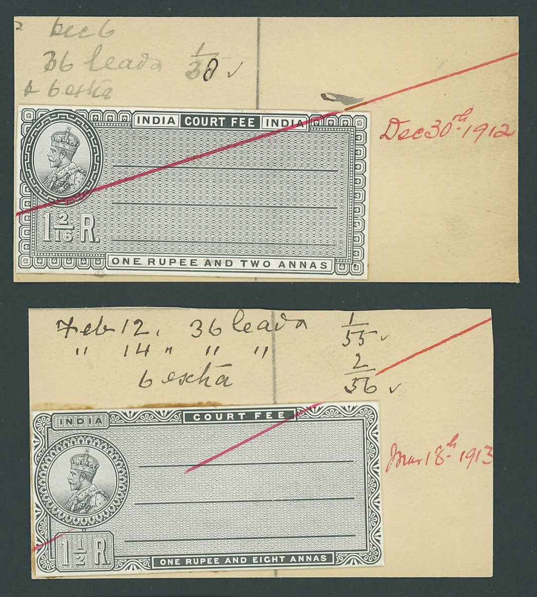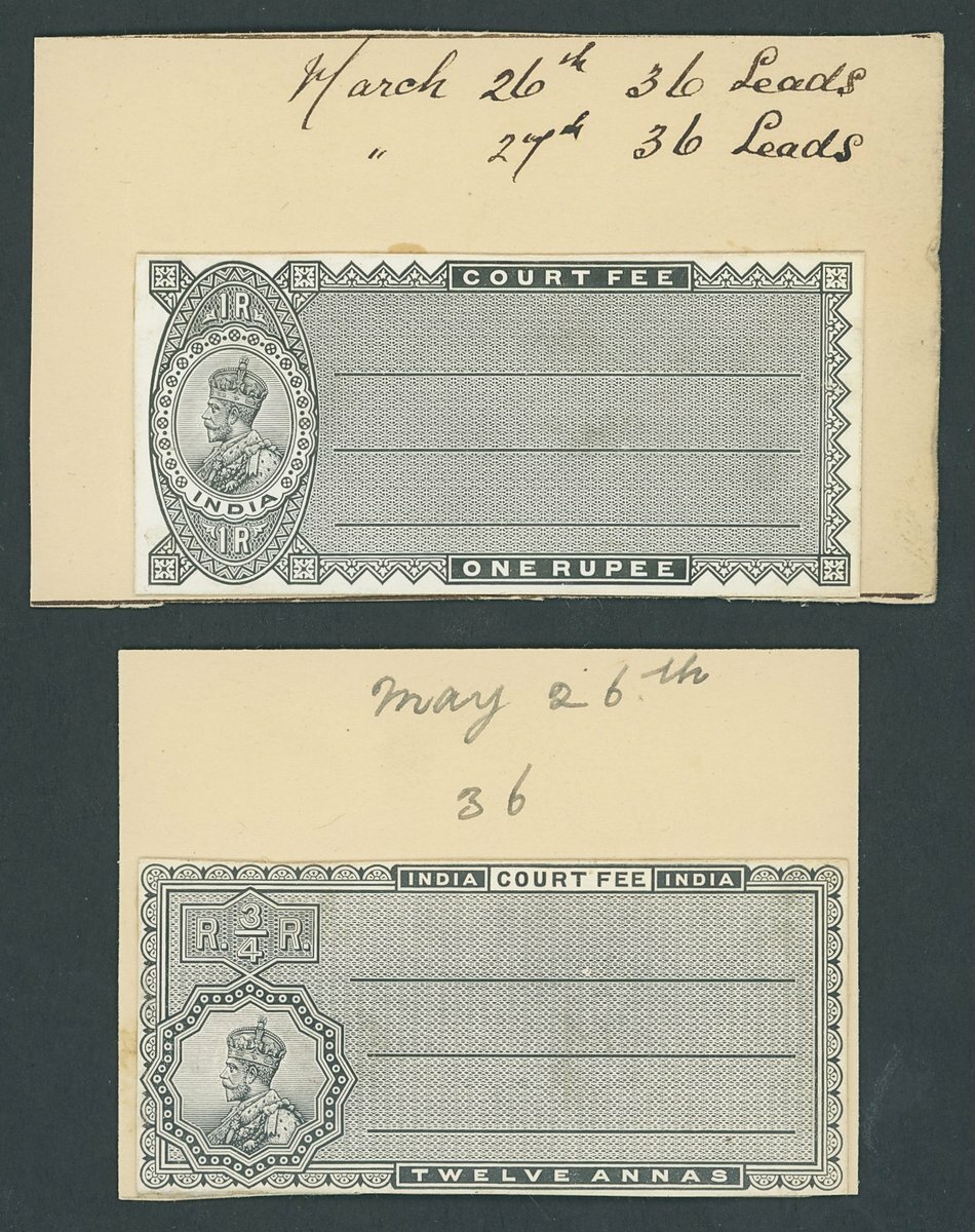 12a. to 1r.8a., four values, die proofs range on glazed card and affixed to pieces from the De La Rue striking book, with details of leads taken, three crossed through in red ink, each dated. Barefoot 248-251.