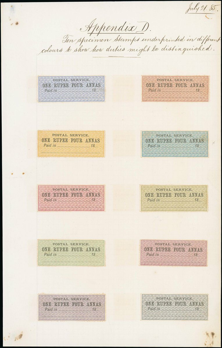 Appendix sheet "D" from the De La Rue record book, annotated "Ten specimen stamps underprinted in different colours to show how duties might be distinguished", dated 21st July 1885, bearing ten perforated 1r4a. essays. Fine and unique. Photo.