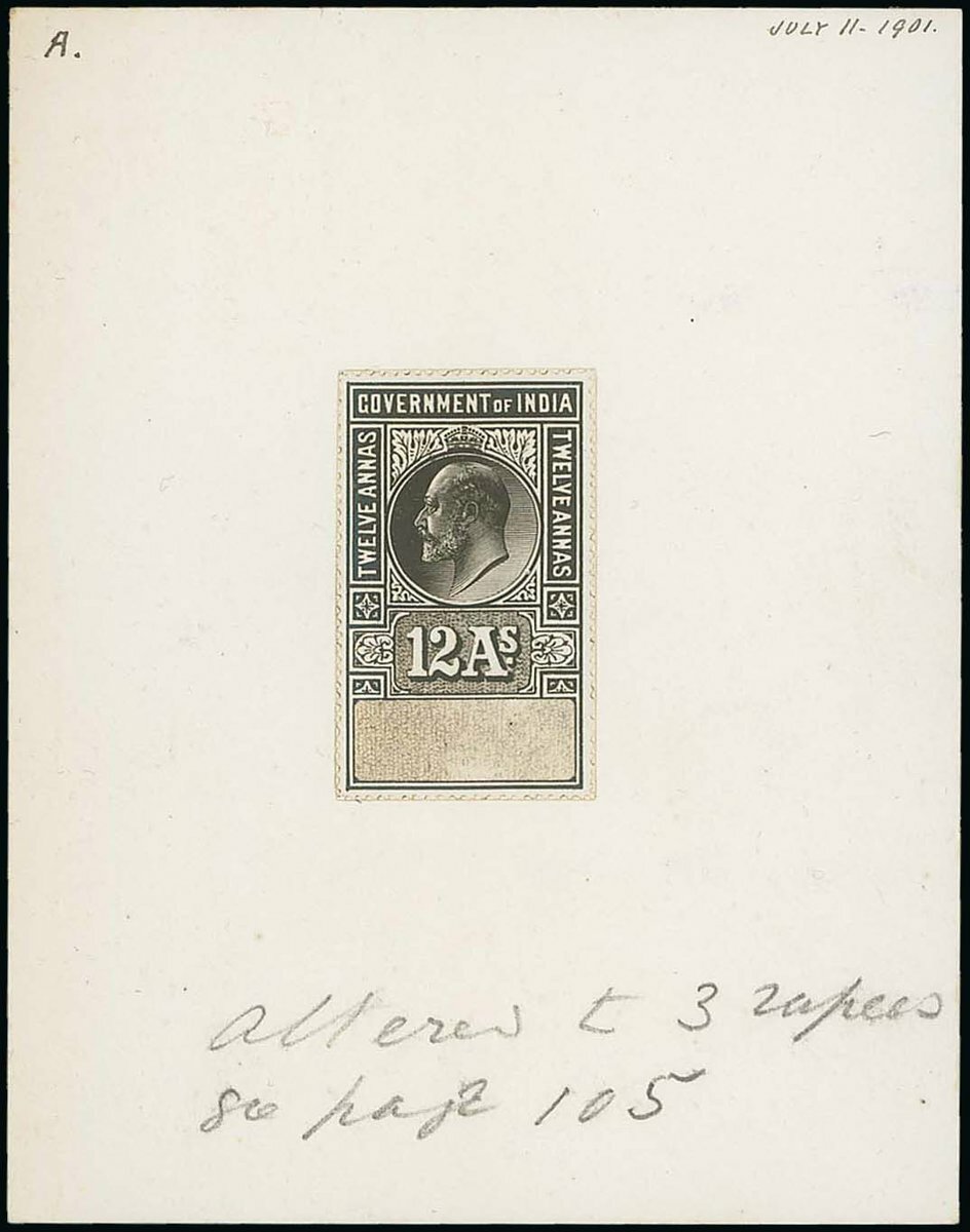 1904 12a., artist's essay in black on card (114x90mm), dated 11th July 1901, without inscription at base, annotated in manuscript "altered to 3 rupees. See page 105", fine. Photo.