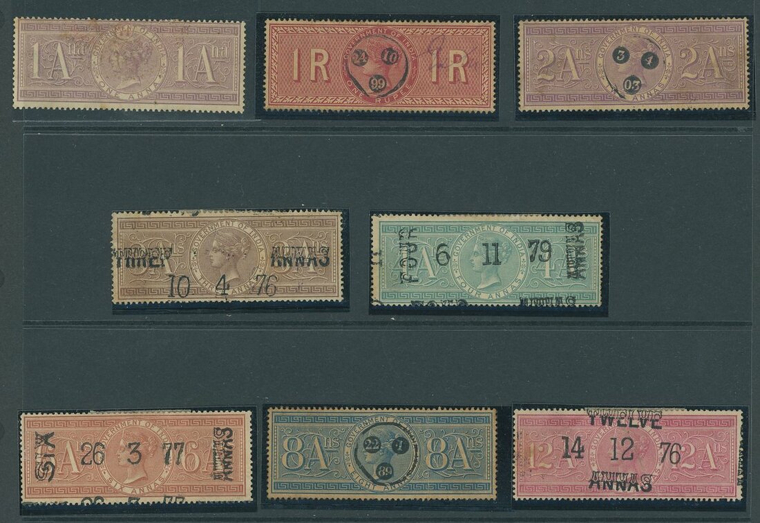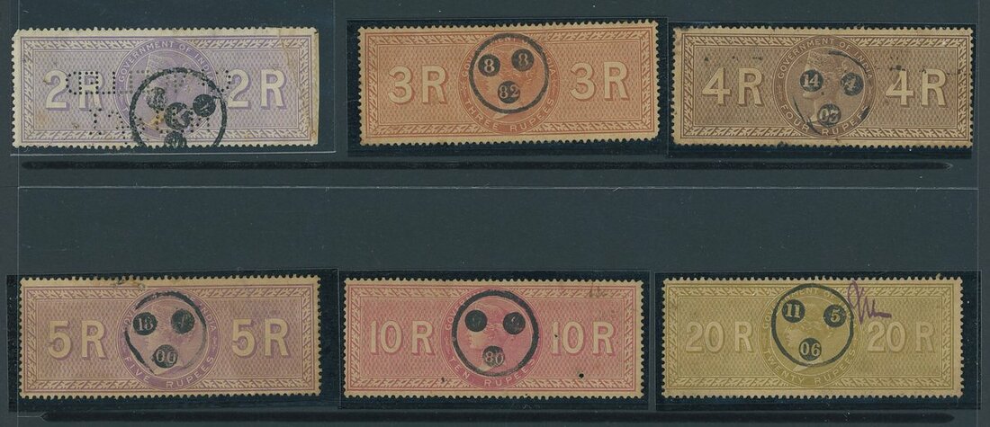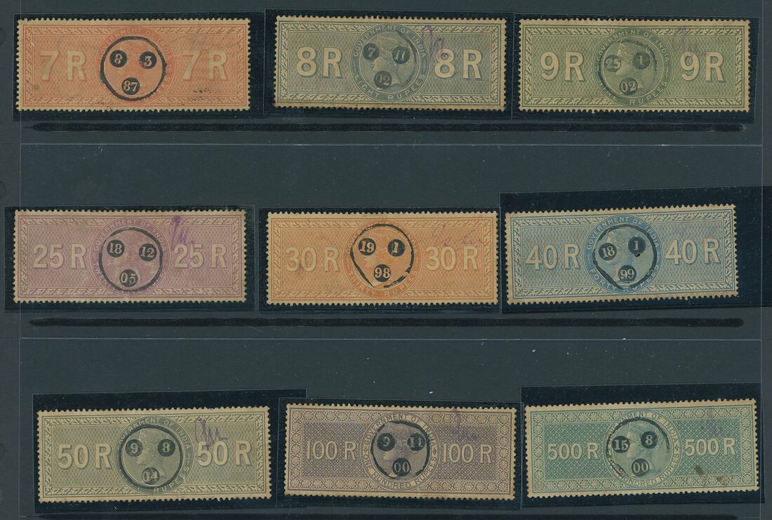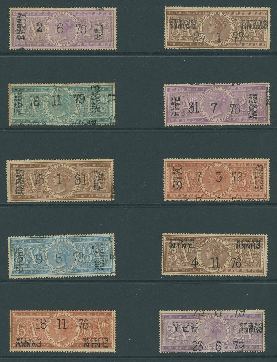 Note: The special Hundi cancellations (not to be mistaken for an overprint) were in use between 1876 and 1881, incorporating the date and the total value of stamps affixed to the document. This was a means to prevent fraudulent addition or removal of stamps.