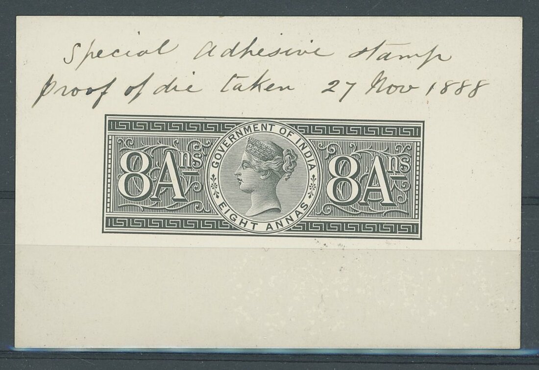 Miscellaneous selection, comprising Type II 8a. die proof inscribed "Special adhesive stamp proof of die taken 27 Nov 1888", 1868 values to 500r. used, also range with special Hundi cancellations