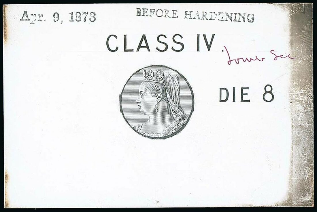QV head die proof in black on glazed card, with