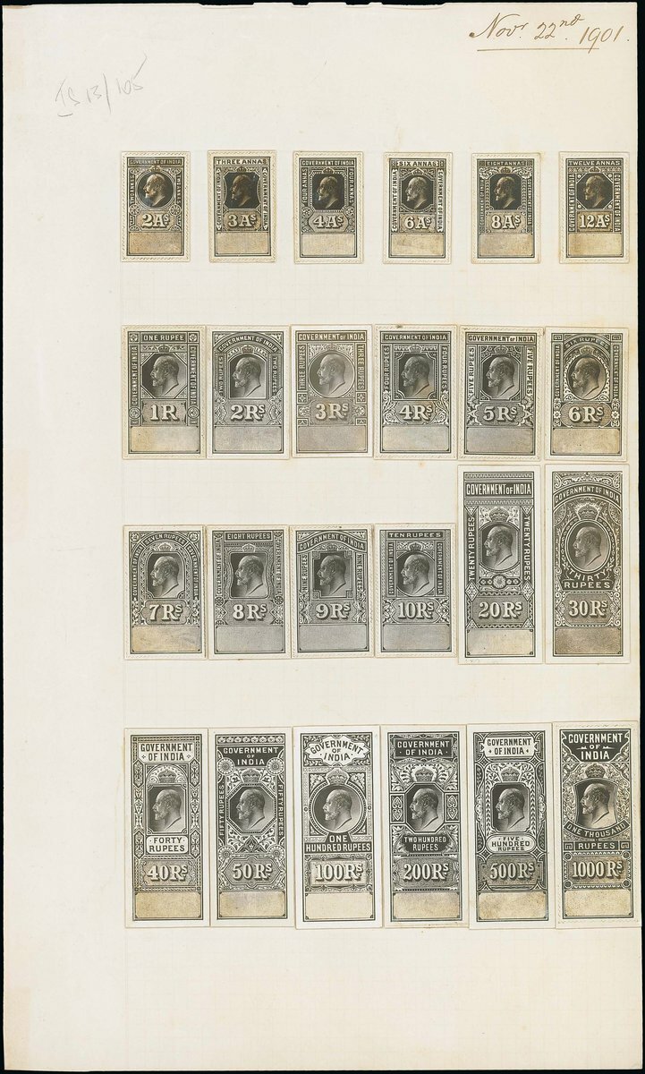 Appendix sheet from the De La Rue record book, dated 22nd November 1901, bearing 2a. to 1000r. die proofs (24) on glazed card, with the lower box blank, for the Foreign Bill, Share Transfer and Special Adhesive revenues, fine. Photo.