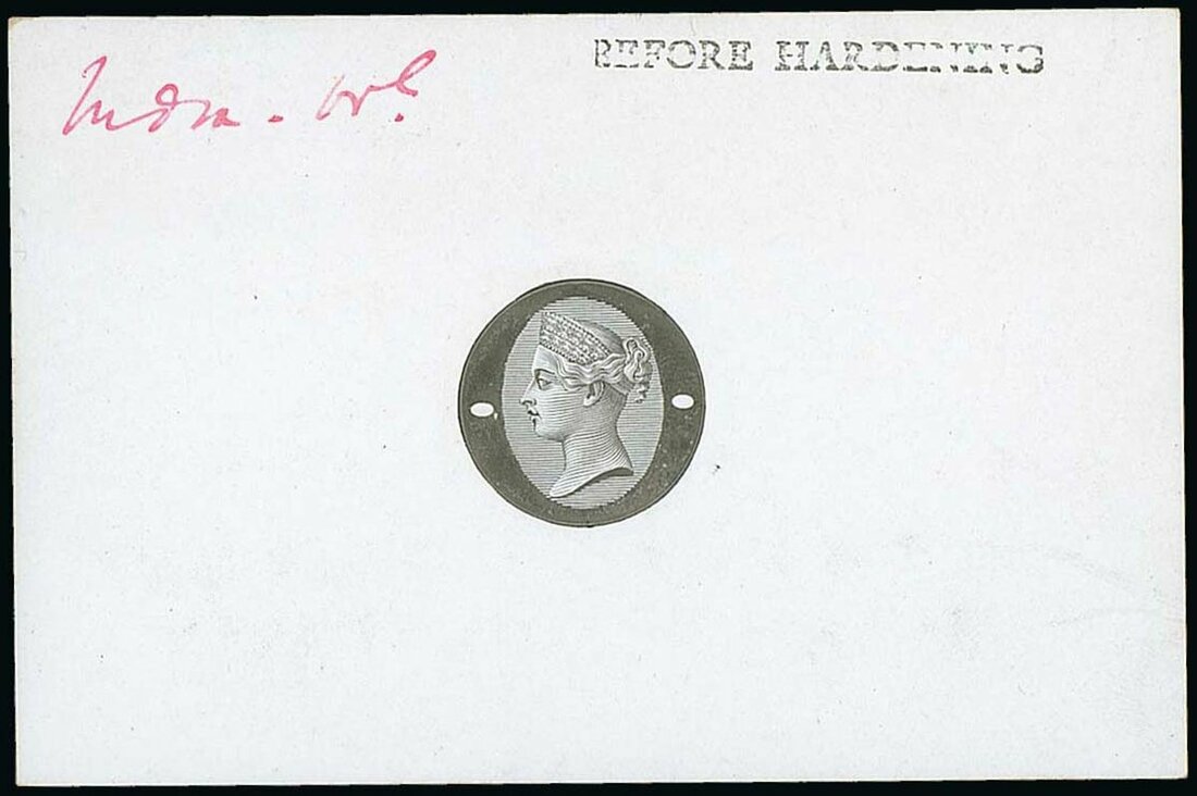 QV head profile die proof in black, with uncleared surround, on glazed card (90x60mm), handstamped