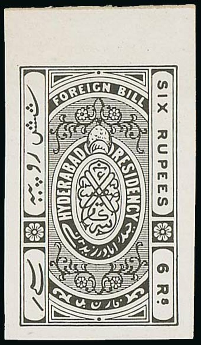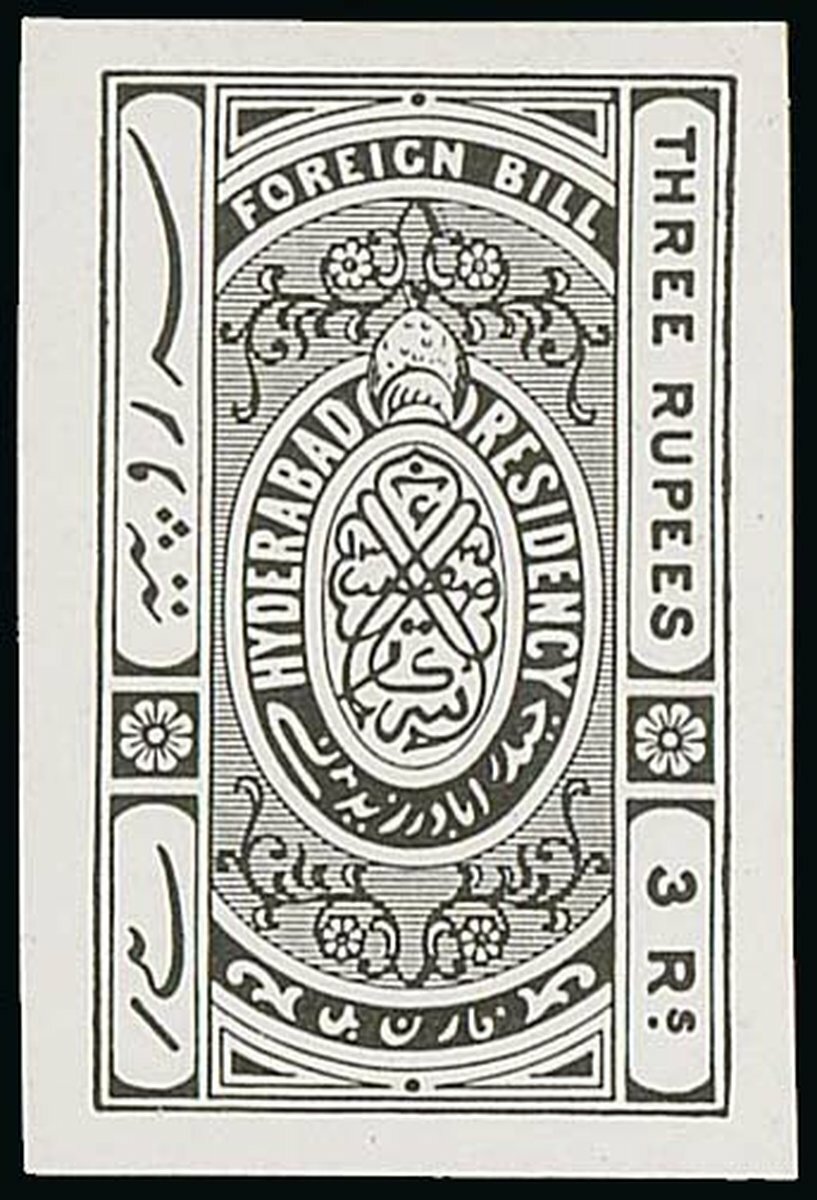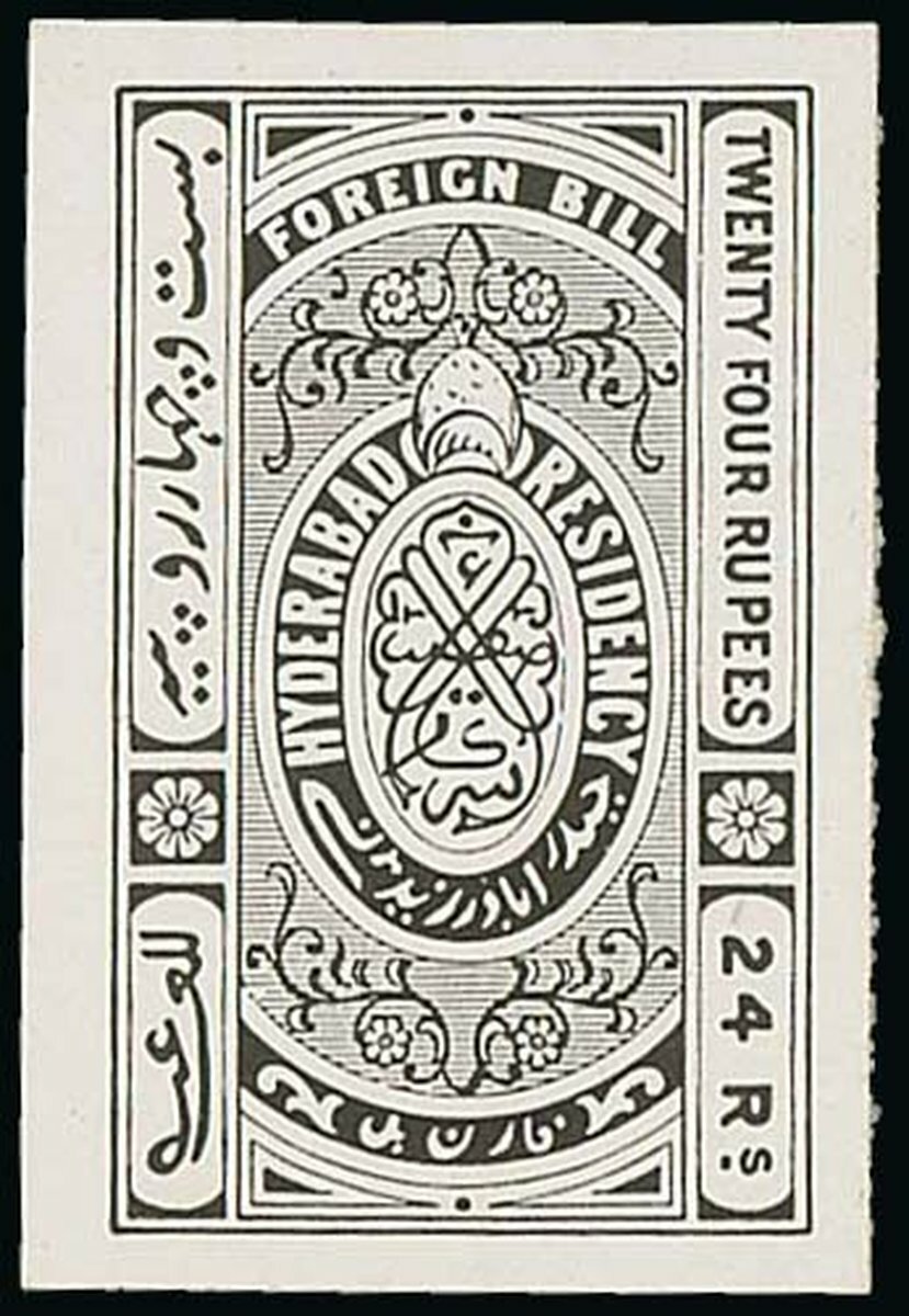 Hyderabad. 1913 Foreign Bill 2a. to 24r., twelve values, imperforate proofs in black on glazed card; fine. Photo.