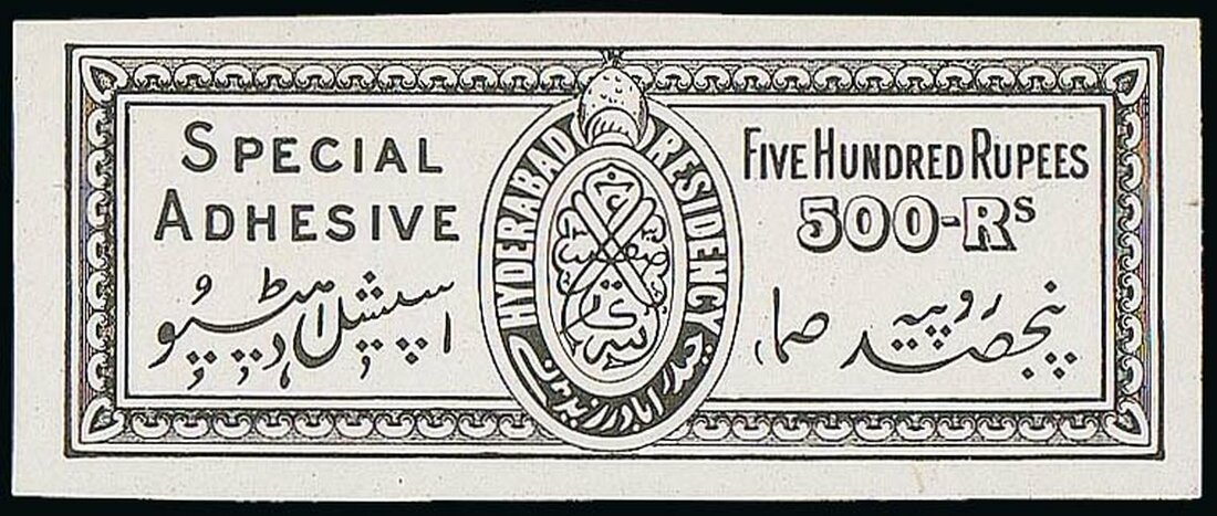 Hyderabad. 1913 Special Adhesive 2a. to 500r., fourteen values, imperforate proofs in black on glazed card; Fine. K&M 852-865. Photo.