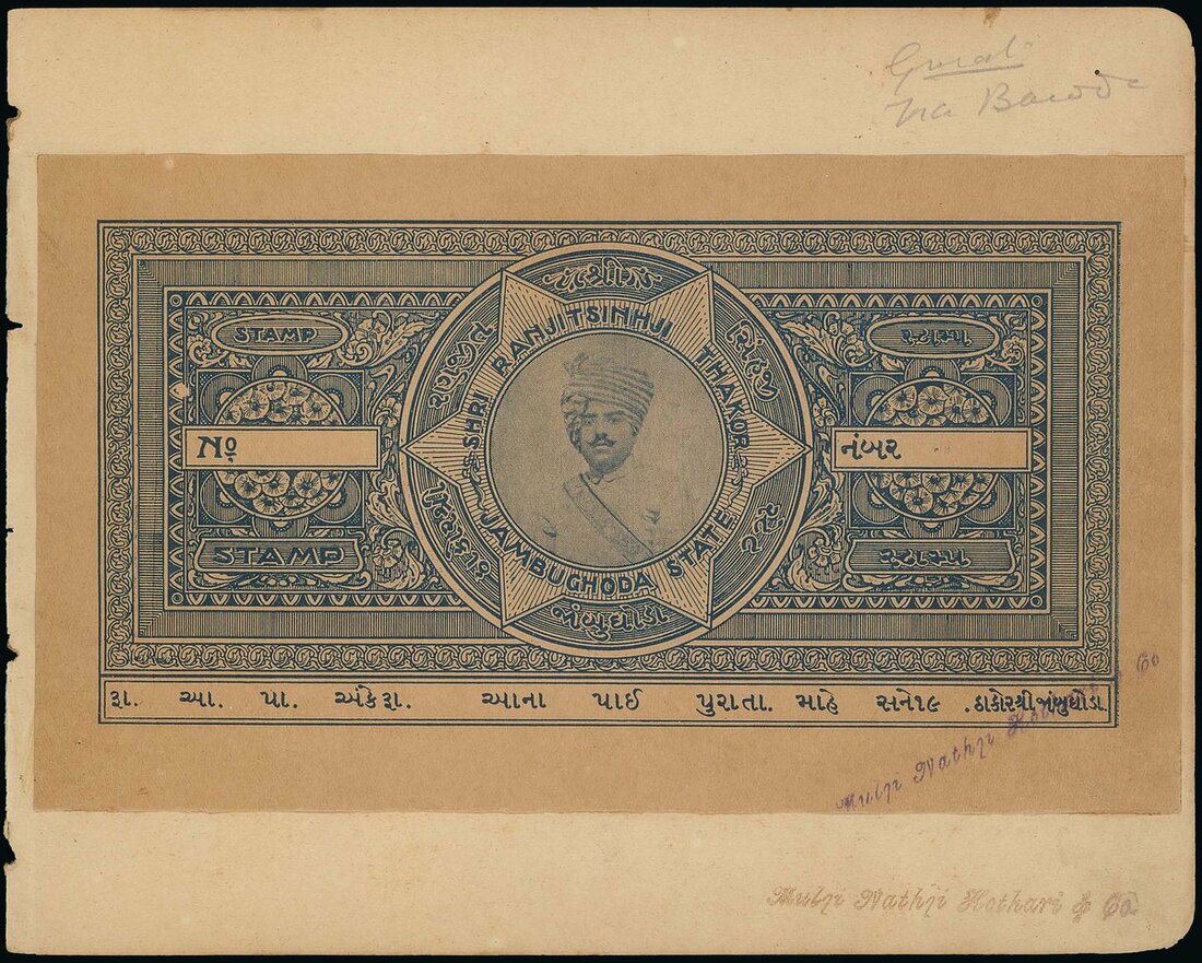 Jambughoda. Undenominated Type 20 stamped paper proof in blue, handstamped "kulji nathji kothari & co" affixed to page marked the same, probably from a printer's samples book. K&M P-203. Photo.
