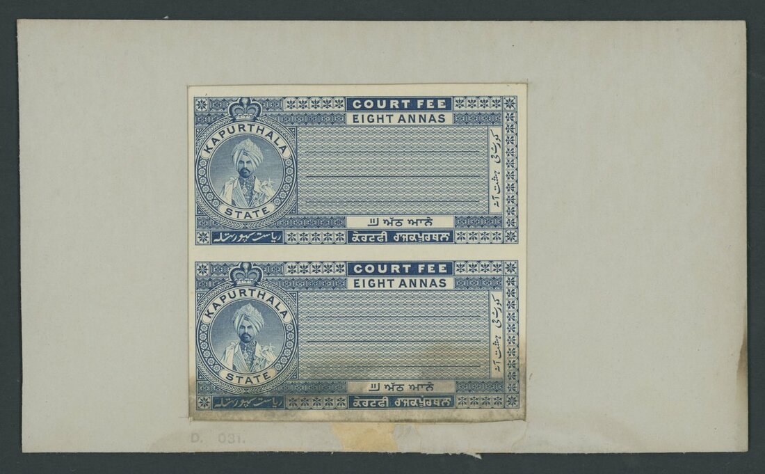 Kapurthala. 8a. Court Fee plate proof pair in blue, inset on thick card (210x125mm); heavy staining on the bottom adhesive with faults to card, with the top unaffected.