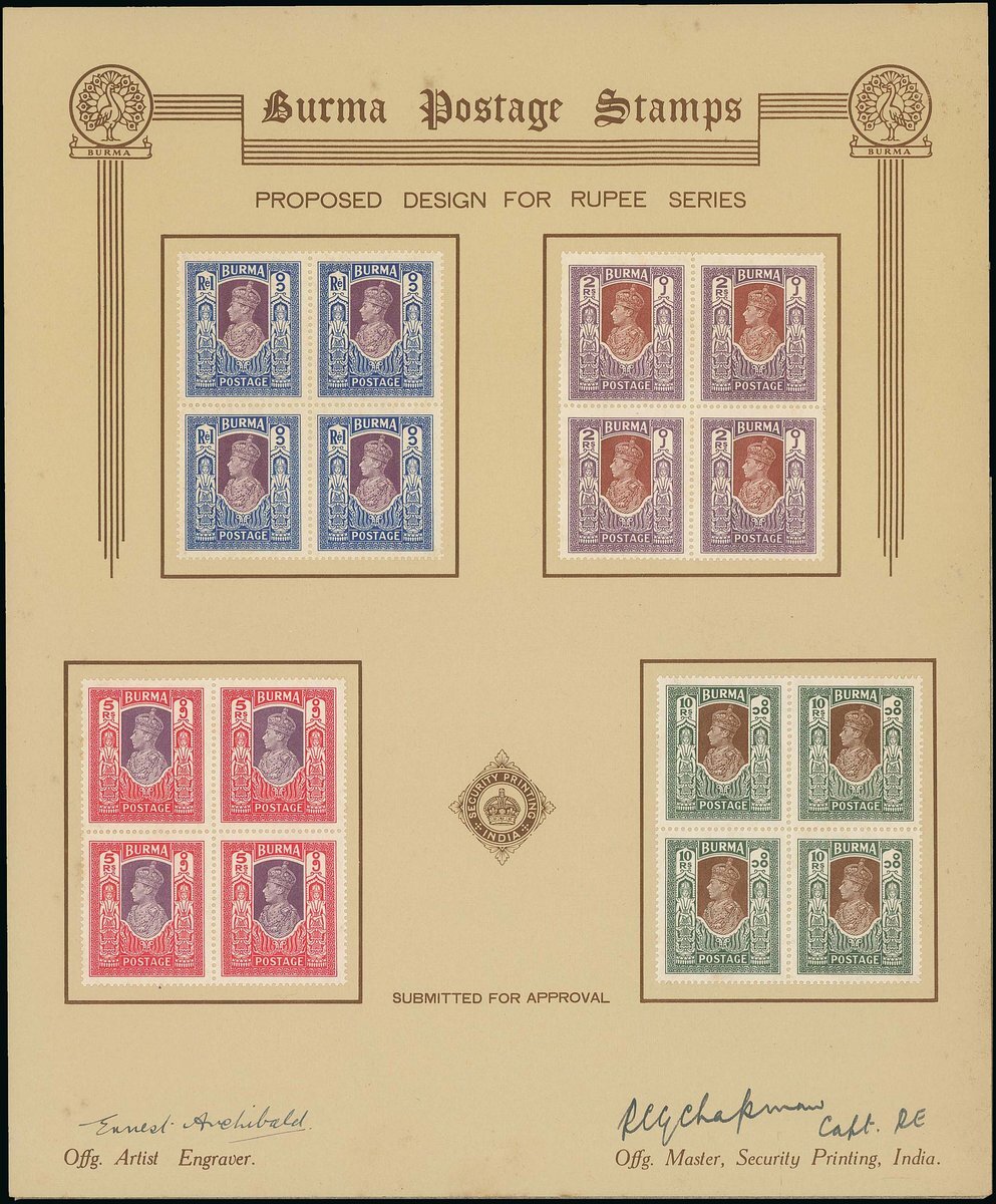 1938 (Feb.) set of seven decorative approval cards each headed "Burma Postage Stamps, Proposed Design for [...]", noted "Submitted for Approval", signed at foot by Ernest Archibal "Offg. Artist Engraver" and RCG Chapman, Capt. RE, "Offg. Master, Security Printing, India.", and bearing perforated lithographic essays on watermark paper for the 1938-40 KGVI definitive issue.