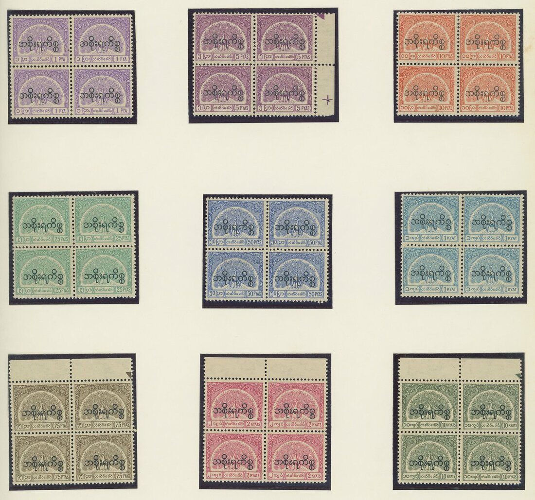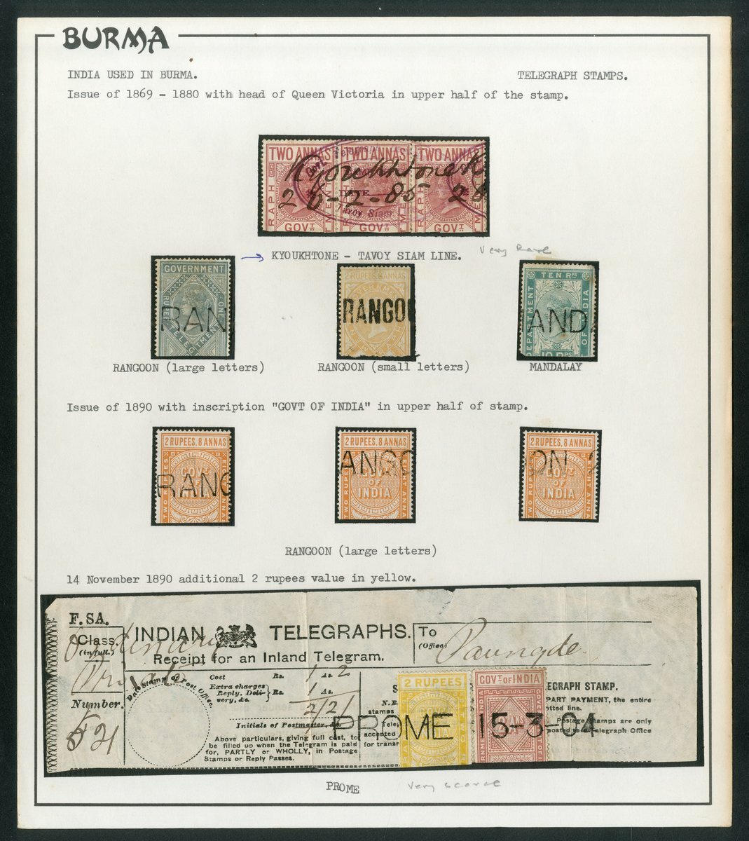 A collection on album leaves (170+), including upper half 1869-80 India 2a. strip of three with Tavoy Siam Line violet oval cancel, 1r., 2r8a. (4), 10r. used in Rangoon, Indian Telegraphs form piece with 2a. and 2r. upper halves tied by