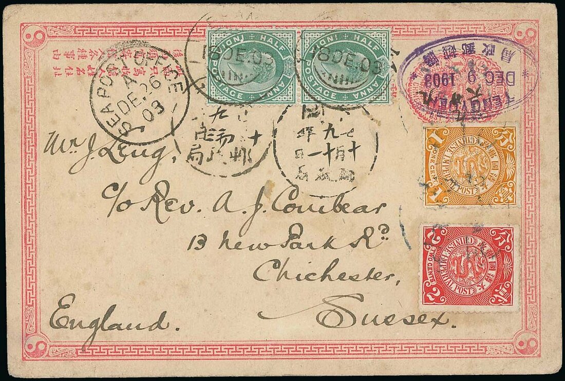 1903 (14 Nov.) China 1c. postcard from Yunnan to England, bearing additional 1c. and 2c. in combination with India ½a. vertical pair cancelled at Bhamo (18.2), showing bi-lingual