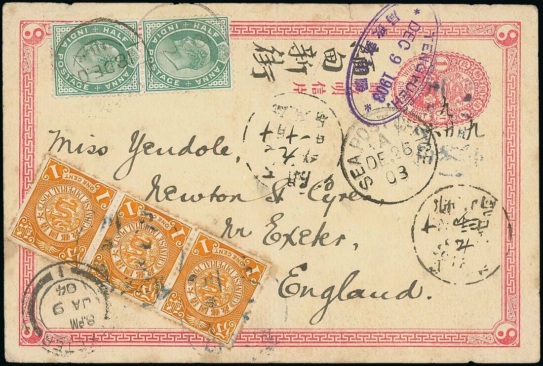 1903 (14 Nov.) China 1c. postcard from Yunnan to England, bearing additional 1c. strip of three, in combination with India ½a. vertical pair cancelled at Bhamo (18.12), showing bi-lingual