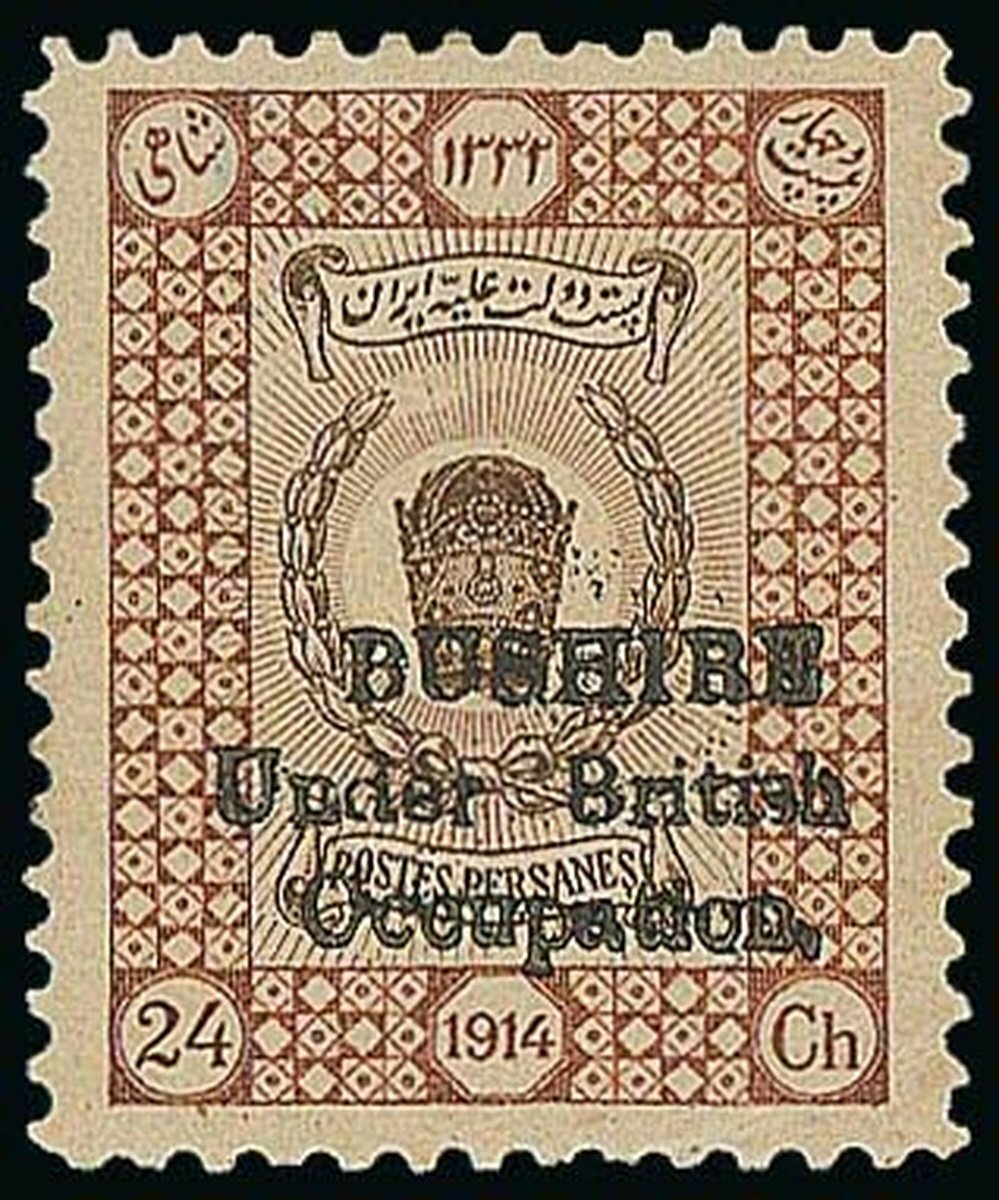 1915 (Sept.) 24ch. sepia and brown, setting II, position 4, large part original gum, well centred. Fine and scarce. Old signature in ink on the reverse. Sadri certificate (2005). Persiphila BU24, S.G. 23, £1,700. Photo