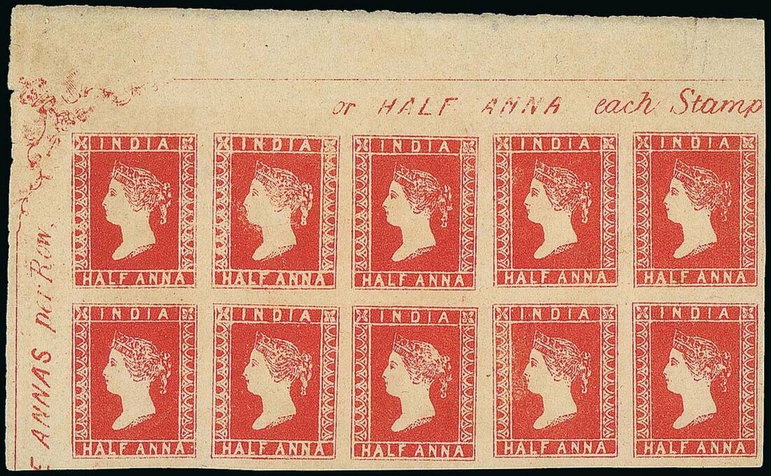 Deep vermilion top left corner block of ten (5x2), very fine. A very rare and impressive multiple. Spence 76; S.G. 1a, £50,000+. Photo
