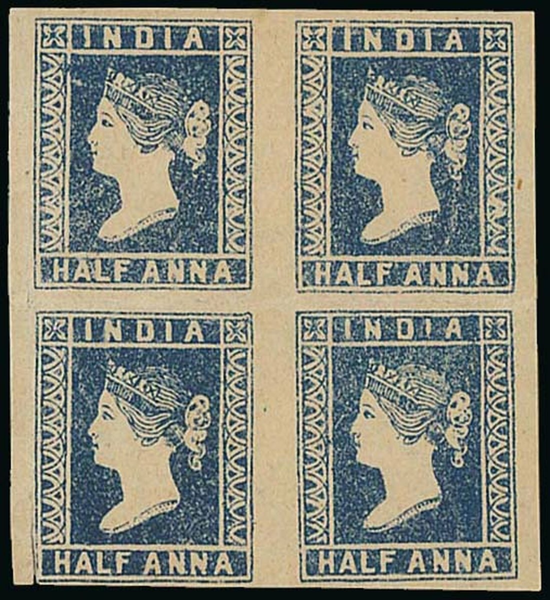 ½a. blue, a block of four with clear to large margins, unused without gum; pressed horizontal crease between the two pairs not affecting the adhesives or the fine appearance of the block, a scarce multiple. S.G. 2. Photo