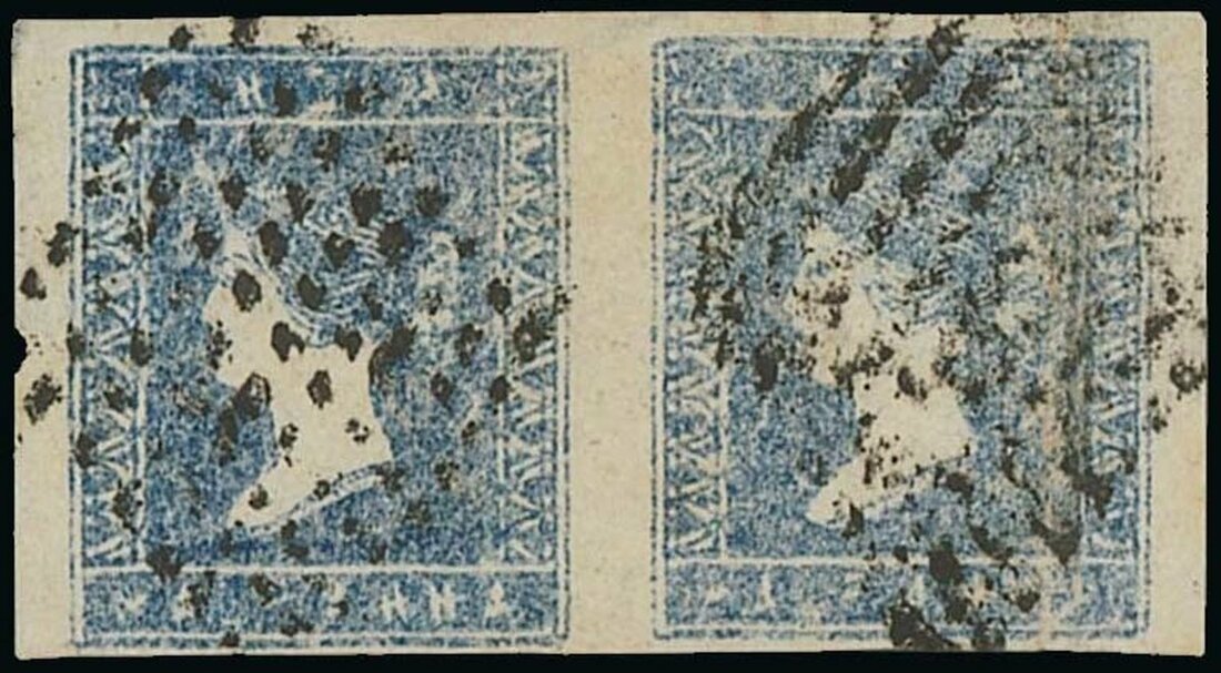 ½a. blue horizontal pair [3-4] with part papermaker’s watermark, variety doubly printed, used with diamond of dots cancellations, right stamp with vertical crease, otherwise fine. A great rarity and unique multiple. B.P.A. Certificate (1993). S.G. 2a, £96,000. Photo