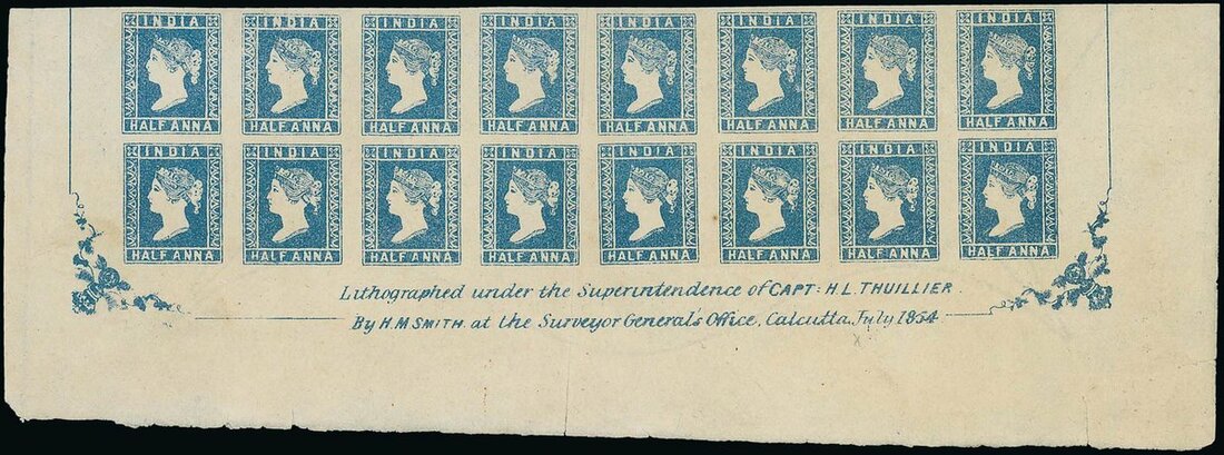 ½a. blue “B” Stone unused block of sixteen (8x2) [81-96] from the foot of the sheet with full inscription dated “July 1854”, vertical crease between fourth and fifth rows which just crosses one stamp, otherwise fine. S.G. 2. Photo