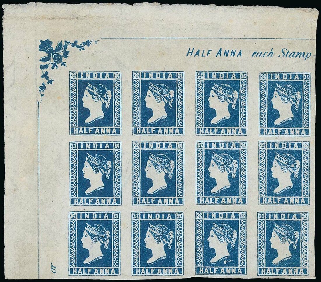 ½a. blue “D” Stone, a block of twelve, [1-4/9-12/17-20], from the upper left corner of the sheet with full margins, remarkable deep colour in the characteristic “sea blue” shade, superb in every respect and without doubt on of the most important half anna lithographed multiples in existence. Photo