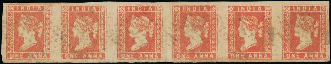 1a. red strip of six, used with indistinct diamond of dots cancels; a scarce multiple, signed A. Diena on reverse, S.G. 12. Photo