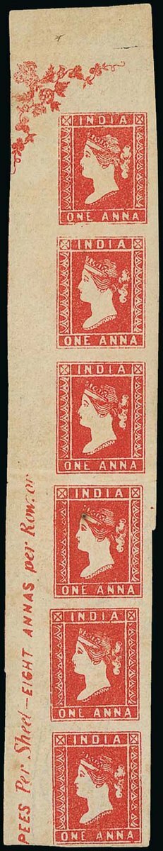 1a. red “A” Stone substituted transfer, an unused top left corner vertical strip of six, [1/9/17/25/33/41] being substituted for [49/57/65/73/81/89], horizontal crease between the third and fourth rows and [25] with small hole in the band below diadem, nevertheless a most remarkable multiple. Photo