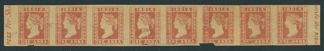 1a. red horizontal strip of eight, unused, with marginal inscription on either side; of toned appearance, with faults including tears, two small ink marks and heavy hinge remainder across the reverse, but a rare multiple nonetheless.