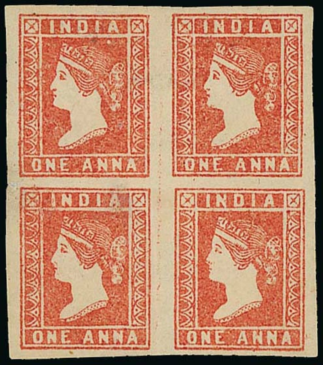 1a. dull red, a block of four with good to large margins, horizontal crease between pairs not affecting the fine appearance; good colour, unused without gum, an attractive and scarce multiple. S.G. 14. Photo
