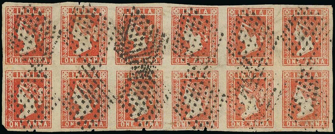 1a. dull red “D” Stone, a block of twelve [33-38/41-46] with good margins, each cancelled with diamond of dots, the lower left corner nibbled, very fine. S.G. 14. Photo