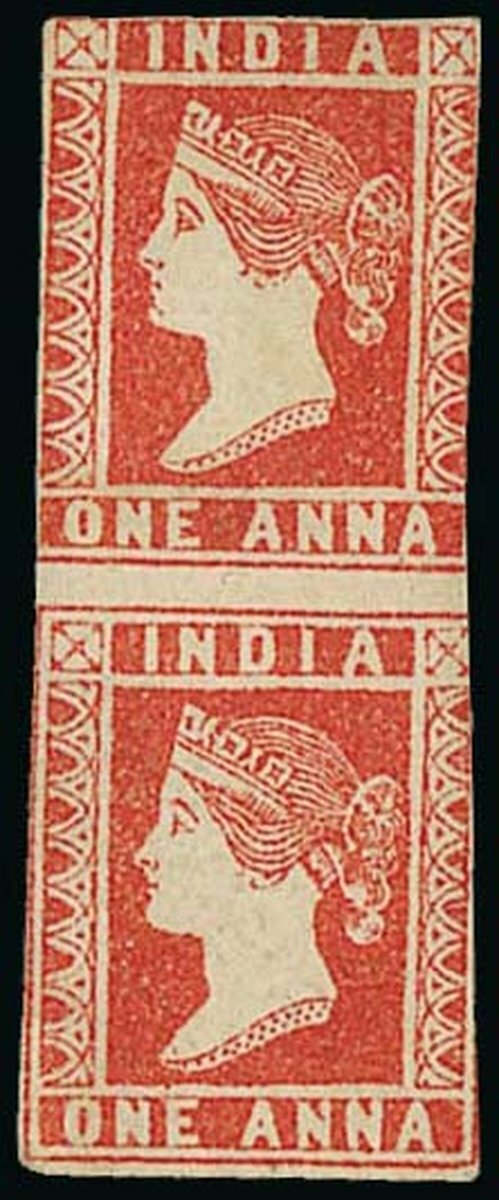 1a. red, an unused vertical pair, cut-into frame lines to a lesser or greater extent on most sides but the foot and only slightly at lower left, nevertheless an exceedingly rare mint multiple with lovely fresh colour and some original gum. S.G. 15, £10,000. Photo