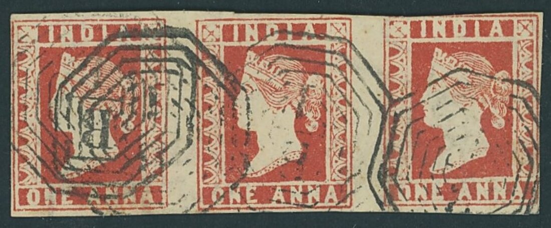 1a. red horizontal strip of three, cancelled with octagonal "B/1"; slightly cut into at right. S.G. 15, £825