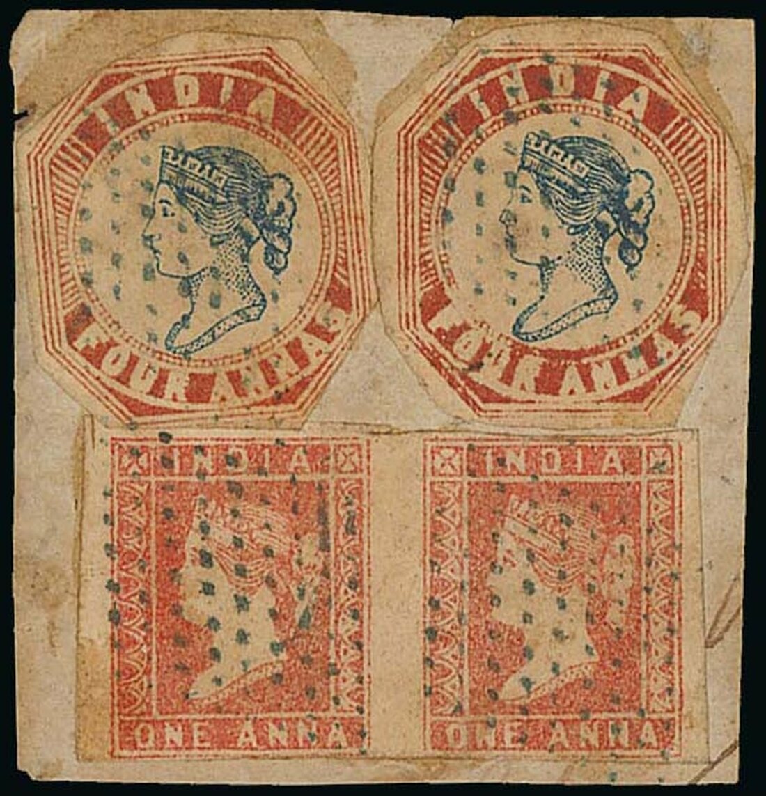 4a. blue and red, Head Die II, Frame Die I, two cut-to-shape examples used with 1a. red Die I pair, all affixed to piece (not tied) and cancelled with diamond of dots; sold on its merits. S.G. 12, 21. Photo