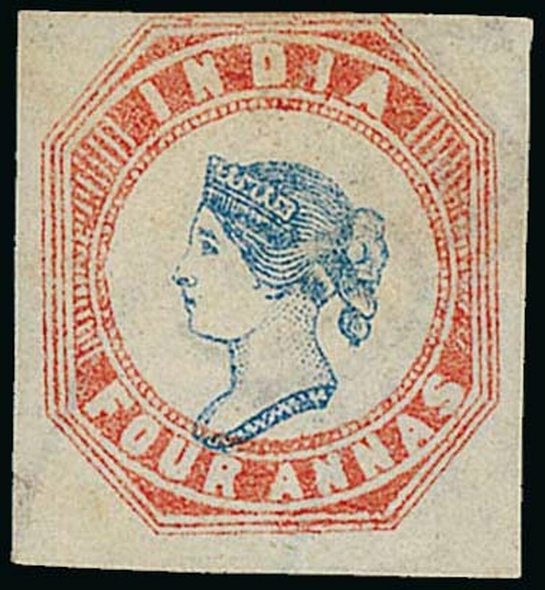 4a. blue and pale red [1], cut-square, unused with large margins on three sides and just touching the frame at top; very small expert repair at lower left and some very faint soiling, unused without gum, a fine example of this very rare first printing. R.P.S. Certificate (2023). S.G. 18, £35,000. Photo