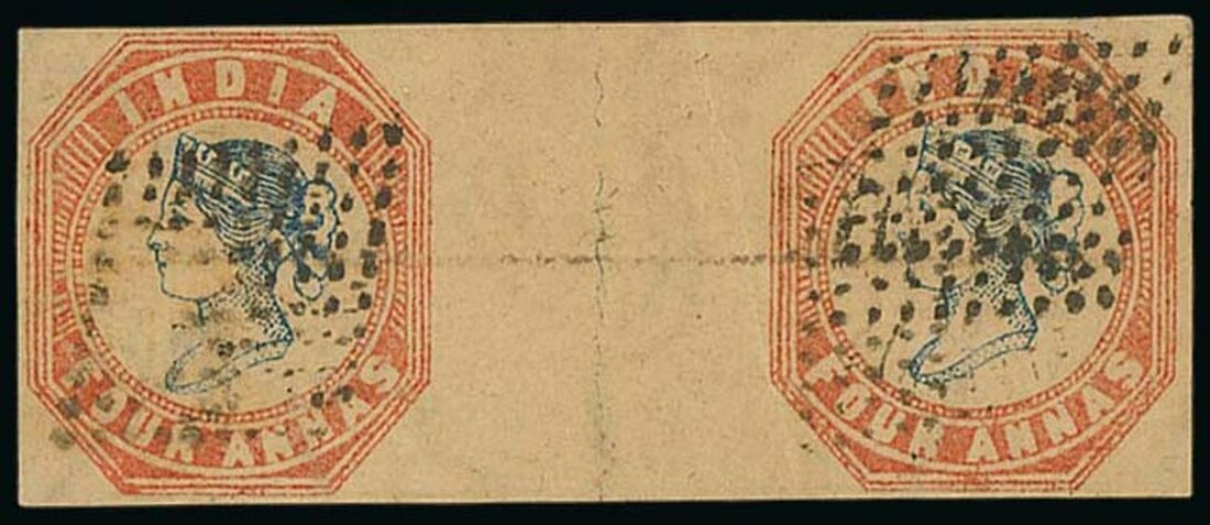4a. blue and red horizontal pair [7-8] cut-square with good margins, both cancelled by diamond of dots; toned, still a rare multiple. R.P.S. Certificate (2024). S.G. 19, £4,750. Photo