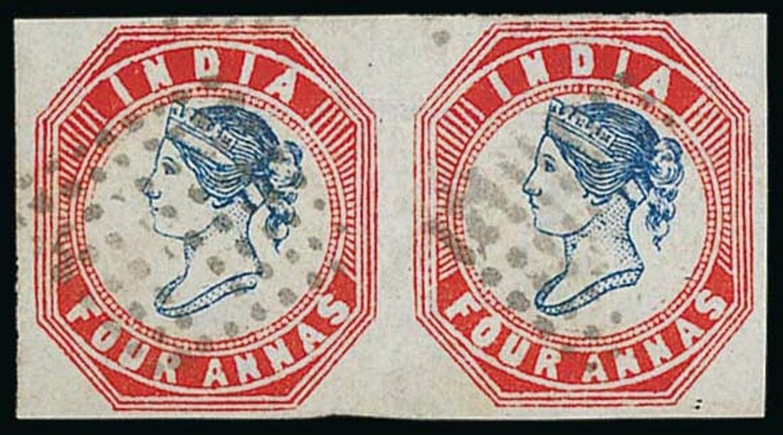 deep blue and deep red horizontal pair [3-4], watermark reversed, with good margins all round, cancelled by lightly struck diamond of dots, very fine and of especially fresh colour. S.G. 22, £3,250. Photo