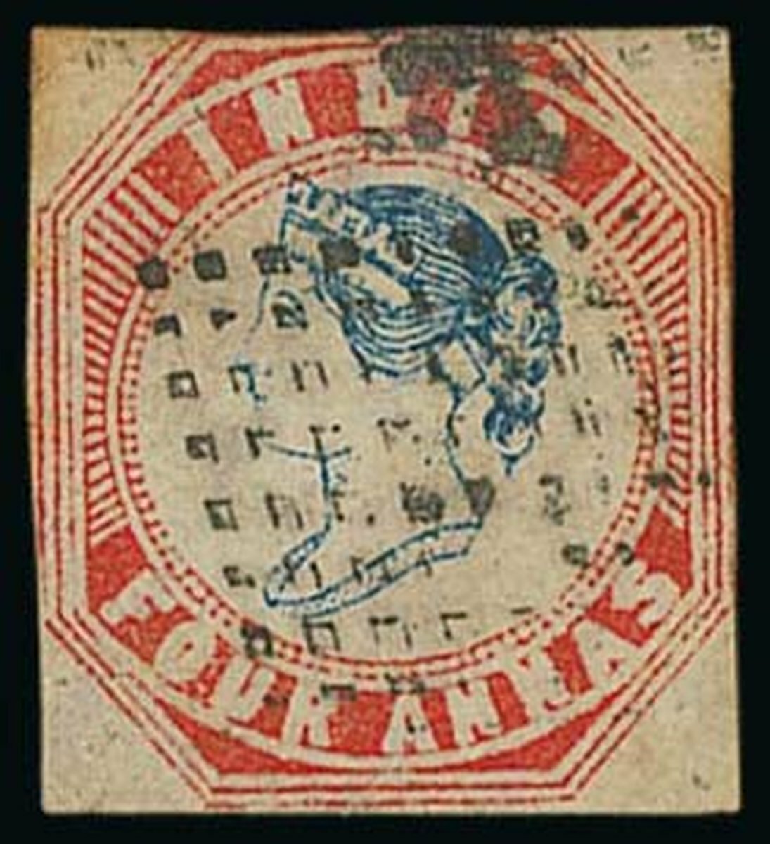 4a. blue and red [18], cut square, just touching at top and right, cancelled by diamond of hollow dots (Singapore). A scarce usage. S.G. 23. Photo