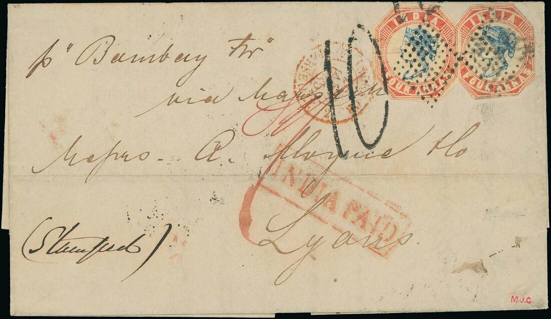 1854 (19 Dec.) entire from Calcutta addressed to Lyon bearing 4a. blue and red Die II, Frame Die I, both cut to shape and cancelled by diamond of dots obliterator, showing on the front framed