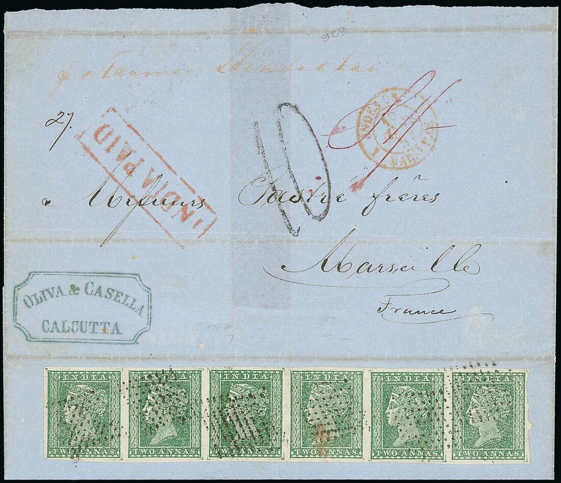1854 large part of entire (reduced in places and opened for display) "Per Steamer Hindostan Via Marseilles" to Marseilles, bearing 2a. horizontal strip of six with good to large margins cancelled by diamond of dots obliterators and showing on the front framed "