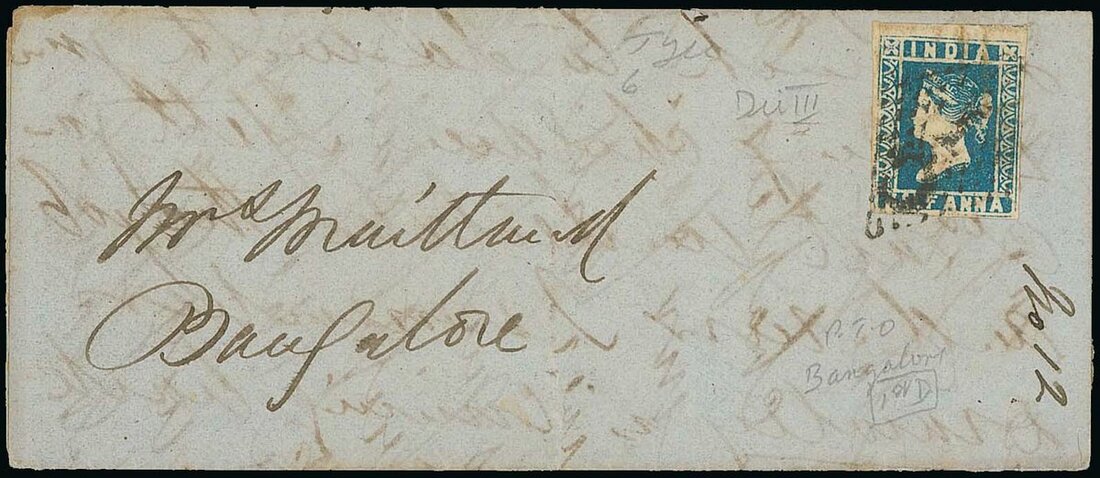 1856 (11 July) entire letter from Madras to Bangalore, bearing ½a. pale blue Die III, cancelled by "C/1" in diamond of dots, Madras, Bangalore and
