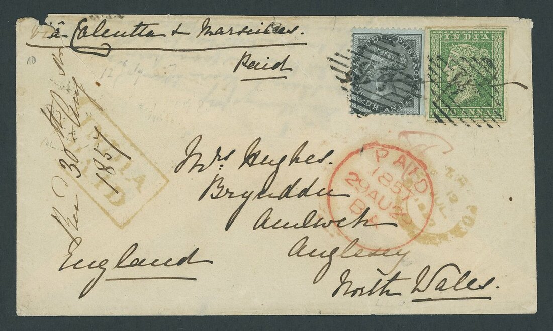 1857 (12 July) envelope to Anglesey (North Wales), marked "via Calcutta + Marseilles", bearing 2a. green in combination with 1855 4a. black on blue glazed paper, tied by numeral "97" and "Stamped" in manuscript, Calcutta transit (16 Jul.) and Bangor arrival (30 Aug.) on reverse; some faults, with tears at top but still of good appearance.