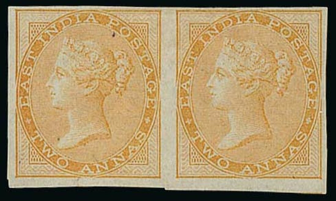 2a. yellow-buff horizontal pair variety imperforate, clear to large margins; large part original gum, fine and scarce. S.G. 42a, £4,250. Photo
