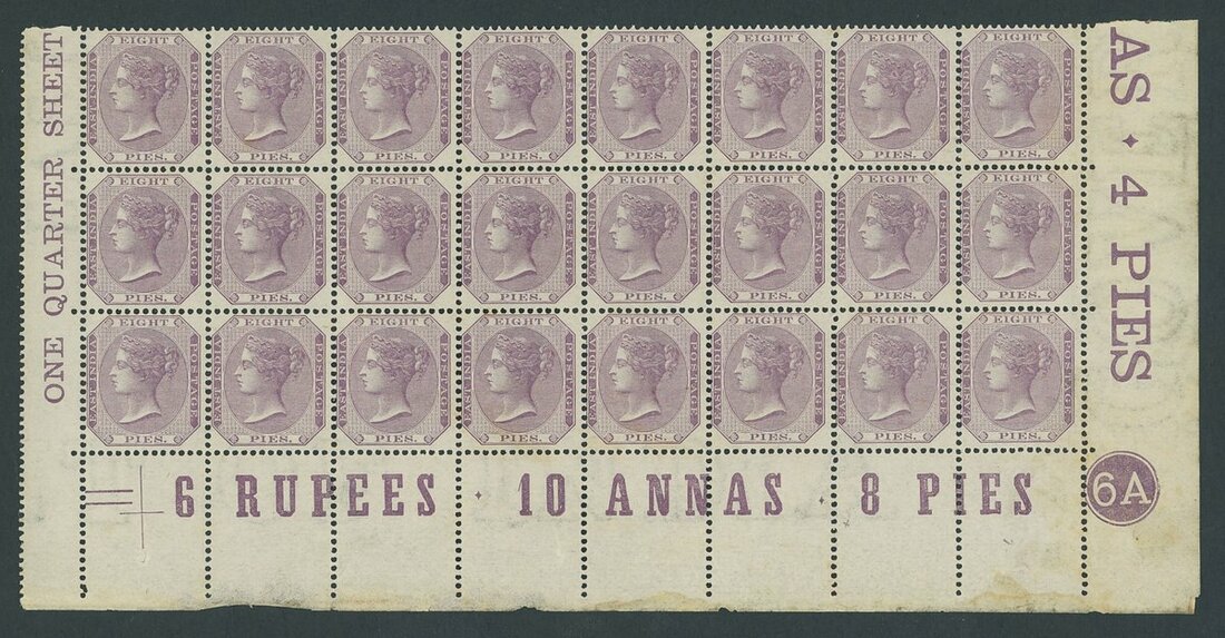 8p. purple, marginal block of twenty-four with full original gum, from the base of the sheet, variety watermark inverted, with marginal inscriptions and plate number 6A, mounted in the margin only; a stunning and rare multiple. S.G. 56w, £1,920.