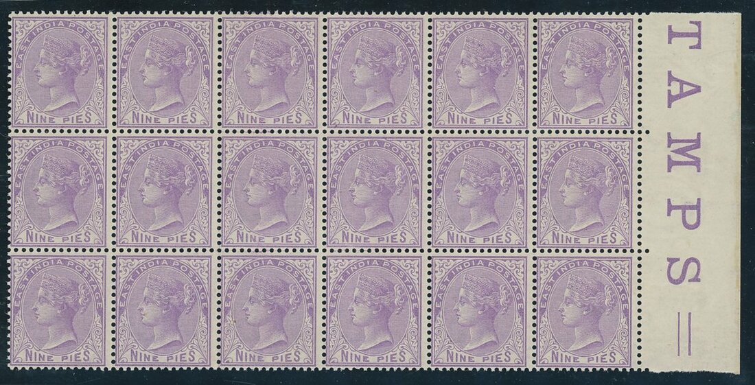 1874 9p. bright mauve block of eighteen (6x3) with margin at right, unmounted mint, very fine and desirable. S.G. 77, £400++