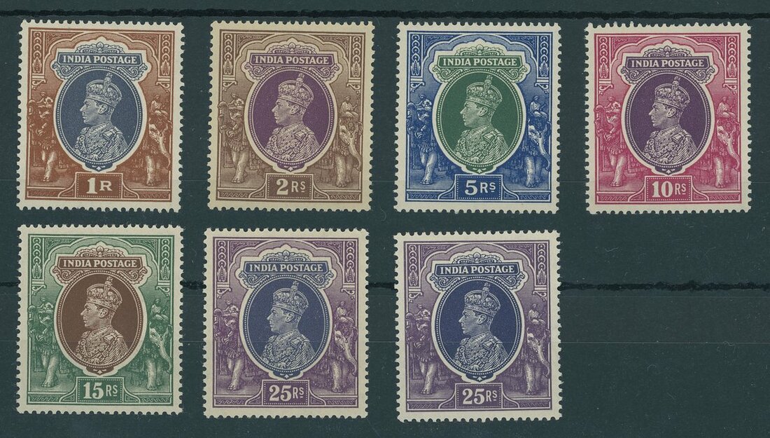 1937-40 1r. grey and red-brown, 2r. purple and brown, 5r. green and blue, 10r. purple and claret, 15r. brown and green (2, one corner example with interpanneau margin) and 25r. slate-violet and purple (2); fine and generally lightly mounted mint. S.G. 259-264, £1,064+