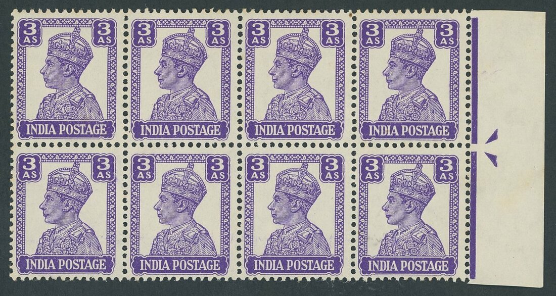 1940-43 3a. bright violet (typo) variety watermark inverted block of eight (4x2) with sheet margin at right, unmounted mint original gum. Some values with light toned spots otherwise fine and scarce multiples. S.G. 271bw, £1,600+