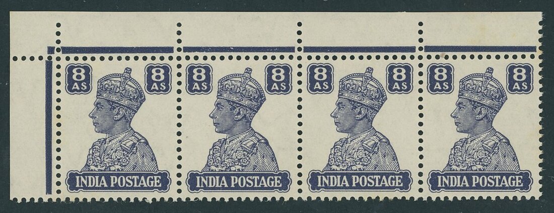 1940-43 8a. slate-violet variety watermark inverted upper left corner strip of four, unmounted mint original gum. A couple of values with light toned spots otherwise fine and scarce multiple. S.G. 275w, £1,500+